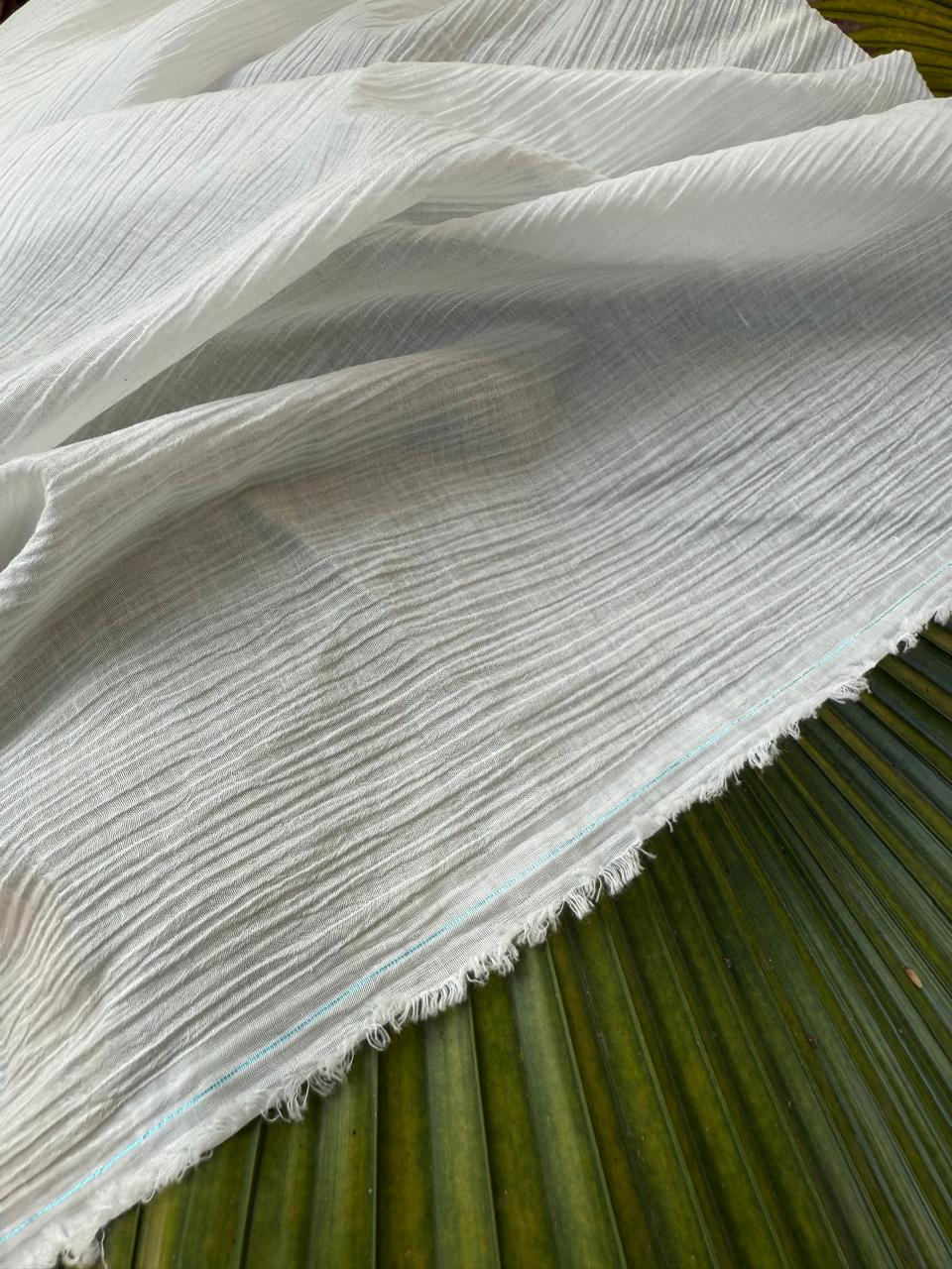 Chanderi Crush is a lightweight, semi-sheer fabric that blends the traditional grace of Chanderi with a crinkled, crushed texture. It offers a soft sheen, airy drape, and a slightly textured surface that adds depth and richness to garments. Ideal for festive wear, ethnic ensembles, dupattas, and fusion wear, this fabric lends a contemporary twist to classic silhouettes while retaining elegance and comfort.
