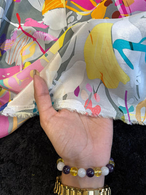 Our Natural Crepe is a canvas of radiant florals where grey meets tropical hues in a dance of joyful contrast. Lightweight yet rich in personality, it’s perfect for statement pieces that turn heads with ease.