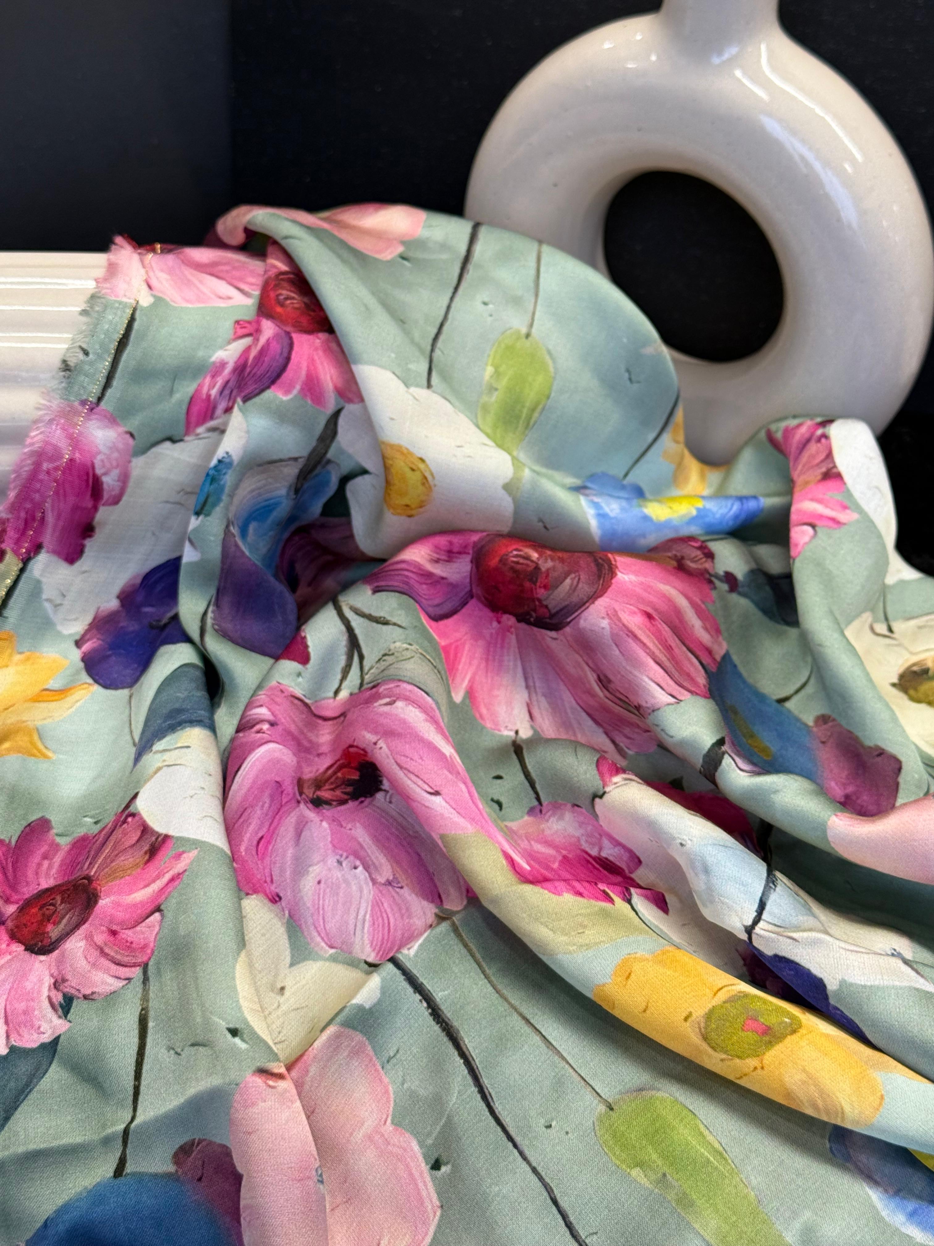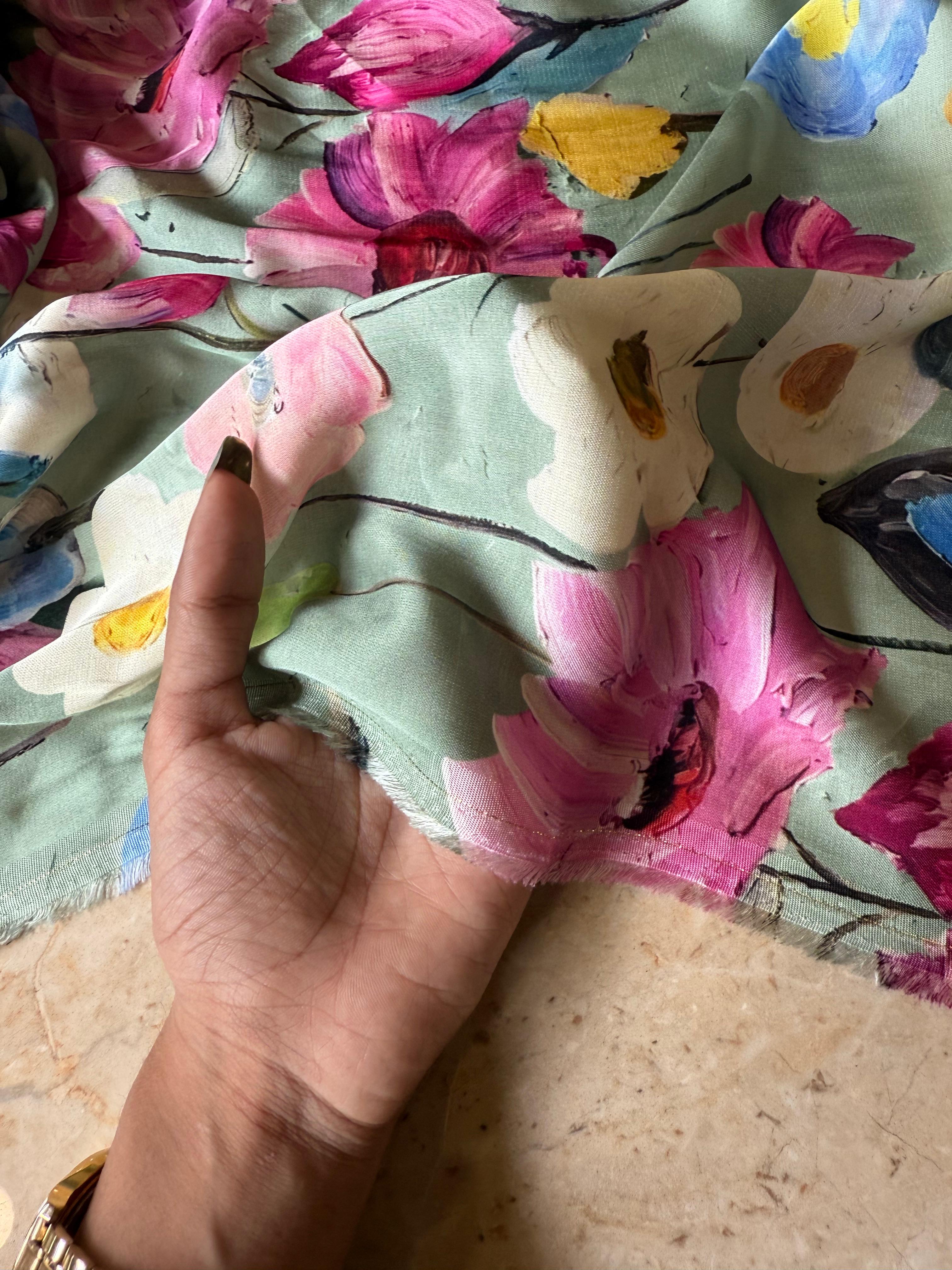 “A vibrant splash of floral artistry on ultra-soft Modal Satin – this breathable, silky fabric offers both comfort and charm, making it ideal for resort wear, fusion styles, and upscale daily fashion.”